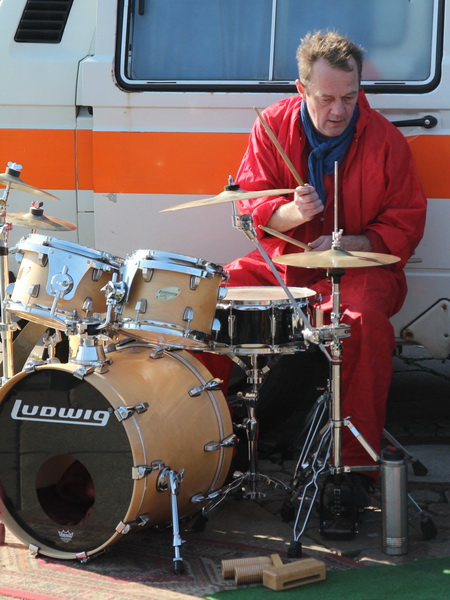 Wir umlaufen den Großen Garten zur Hälfte, wo ich mir an der Südseite an der V-Stelle den gut eingeschenkten Becher Tee zur Hälfte übers Trikot sabbere. So kann ich unfreiwillig die Feuchtigkeit abweisende Funktion meines neuen Jagaball-Shirts testen. Der Tee perlt ab, wie verzaubert. Eine Rockband am Eingang zum Großen Garten lenkt von meinem Missgeschick ab.