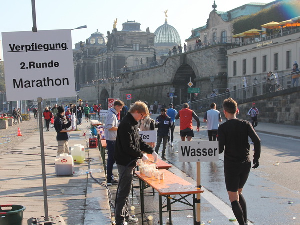 Das Stück auf der Striesener- und Pillnitzer Straße bringt uns der Altstadt wieder näher, denn die markanten Kuppeln der historischen Gebäude sind wieder zu sehen. Der Rathenauplatz (benannt nach dem in der Weimarer Republik ermordeten Außenminister Walter Rathenau) entstand in Folge des Baus der Carolabrücke. Aufgrund der vielen Namensänderungen (u.a. Amalienplatz, Schlageterplatz und Rathenauplatz) wurde er im Volksmund auch Arsch-Platz genannt. Ich hoffe, da am Ende meines Rennens nicht zu sein. Der 17. Kilometer ist auf der Carolabrücke markiert. Unten auf dem Elberadweg sehe ich bereits die Marathonspitze zu Beginn ihrer zweiten Runde.