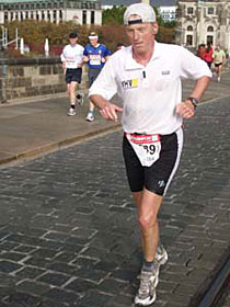 Dann war ich zum dritten Mal auf der Augustusbrücke und km 41 war erreicht. Jetzt konnte ich auch rechts abbiegen und über den Schlossplatz am Landtag vorbei Richtung Ziel vorm Congress Centrum laufen. Der Ansager, der die ganzen Stunden vorher die Leute im Zielgebiet unterhalten hatte, sagte mich an. Die Stimme kannte ich doch. Richtig, es war der vom Bremerhaven Marathon. Anscheinend wird er für solche Veranstaltungen gebucht. Dann werde Ihn wohl noch öfter sehen. Kurzer Wink zu ihm und Zieleinlauf nach 4:14:59 Std.