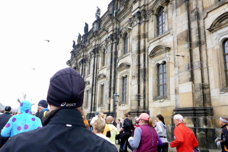 Wir laufen noch schnell über den Schlossplatz und überqueren dann die Elbe auf der Augustusbrücke. Ein Blick zurück beschert uns einen tollen Blick auf die Kulisse der Dresdner Altstadt. Unglaublich, dass wir gerade erst mal einen Kilometer zurückgelegt haben. Wir erreichen den Neustädter Markt. Dort thront der „Goldene Reiter“, ein Reiterstandbild des sächsischen Kurfürsten August des Starken. Es ist Dresdens bekanntestes Denkmal. Die Statue zeigt August als römischen Caesar mit Rüstung auf einem Lipizzanerhengst reitend. Ursprünglich war das Denkmal feuervergoldet, bei seiner Restaurierung 1956 benutzte man Blattgold.  Wir kommen beim Laufen heute nur das Hinterteil des Gauls zu sehen, denn August blickt in Richtung Polen und hat an uns Läufern offensichtlich kein Interesse.