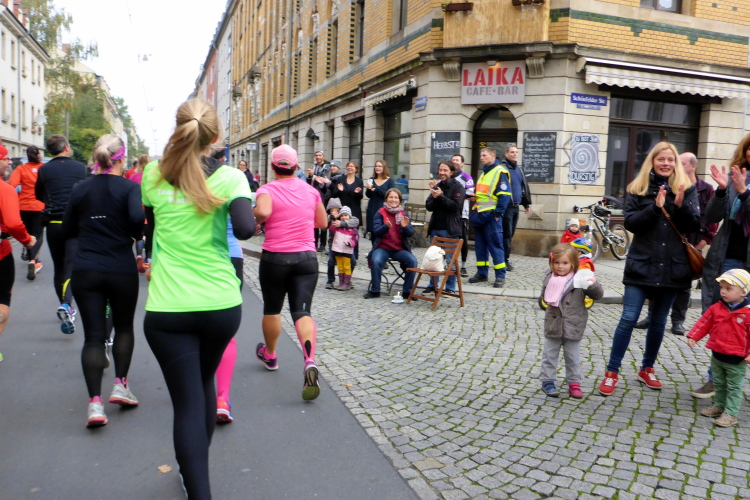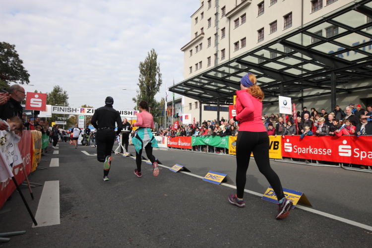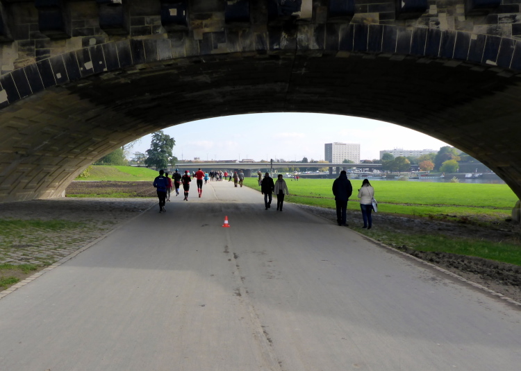 Hier sind wir nun nicht mehr alleine. Zahlreiche Familien nutzen das schöne Wetter für einen Spaziergang im Park, manchmal gibt es sogar Applaus. Schließlich liegt der Park wieder hinter uns. Es zieht sich noch etwas, bis wir zum zweiten Mal den Rathenauplatz erreichen und auf dem Terrassenufer in Richtung Ziel laufen dürfen. Die letzten zwei Kilometer sind ein Traum und die schweren Beine sind vergessen. Ein letztes Mal geht es an der Brühlschen Terrasse vorbei, unter der Augustusbrücke hindurch und wieder hoch in Richtung Ziel. Ich fliege nun förmlich und habe keine Zeit, mit Silke und Wolfgang abzuklatschen, die am Zieleinlaufkanal stehen.
