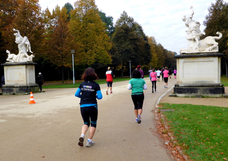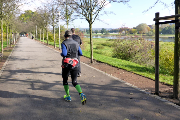 Die nächsten drei Kilometer verlaufen relativ unspektakulär über die Fletscher Straße in Richtung „Großer Garten“, einem Park mit barocken Ursprung. Er ist die größte Parkanlage Dresdens und wurde ab 1676 auf Geheiß des Kurfürsten Johann Georg III angelegt und im Lauf seiner Geschichte mehrfach erweitert. Heute weist er eine Fläche von 1,8 Quadratkilometern auf. Das bedeutendste Bauwerk des Parks ist das um 1680 errichtete Sommerpalais. Auch der Botanische Garten und der Zoologische Garten haben hier ihren Platz. Wir laufen direkt auf das Sommerpalais zu, umrunden es kurz und passieren auch den Palaisteich, bevor wir den Park bei Kilometer 17 wieder verlassen. Zurück auf der Fletscher Straße haben wir nun ein kurzes Begegnungsstück mit den langsameren Läufern.