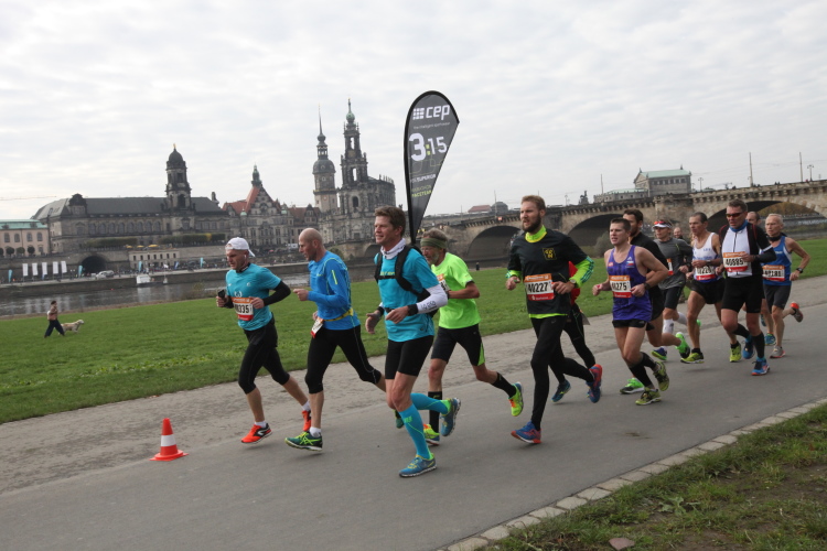 Nach dem Unterqueren der Augustusbrücke teilt sich die Strecke. Die Halbmarathonis dürfen geradeaus in Richtung Ziel laufen. Mir wird der Weg nach links gewiesen. Es geht in die zweite Runde, die jedoch nur zu rund 40 Prozent mit der ersten identisch ist. Wieder laufen wir über die Augustusbrücke. Kurz vor dem Japanischen Palais, einem historischen Bauwerk, das heute als Museum dient, biegen wir ab in Richtung Elbe. Drei Kilometer laufen wir nun direkt an der Elbe entlang. Der Blick über den Fluss auf die Dresdner Altstadt ist einmalig. Auf der nördlichen Elbseite passieren wir zunächst das Finanzministerium und kurz darauf die Staatskanzlei. Wir befinden uns am sogenannten Königsufer direkt im Regierungsviertel. Es ist herrlich ruhig hier und nur ein paar Spaziergänger kommen uns entgegen. Auch die Wolken haben sich verzogen und ich sehe Dresden erstmals unter blauem Himmel. Schöner könnte es gerade gar nicht sein. Viele Läufer sind nicht um mich rum, aber ich bin nicht alleine.