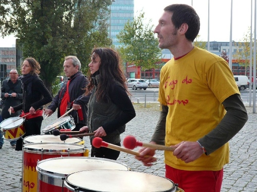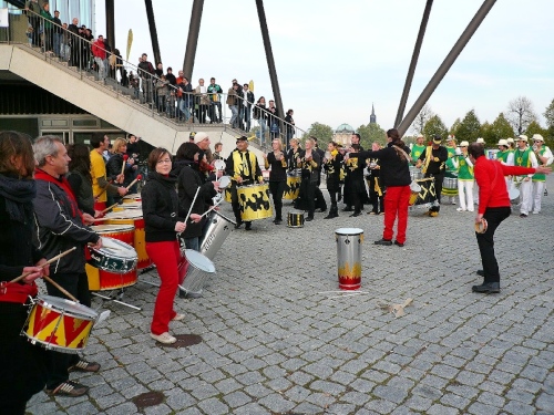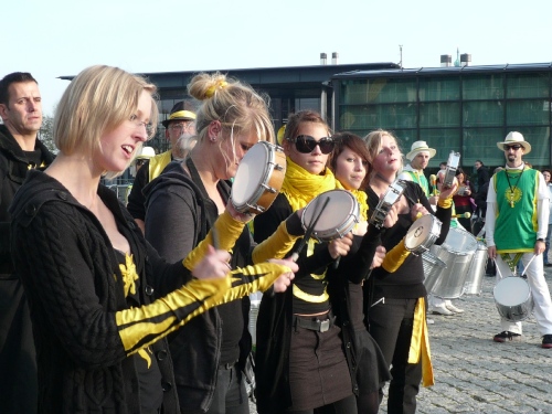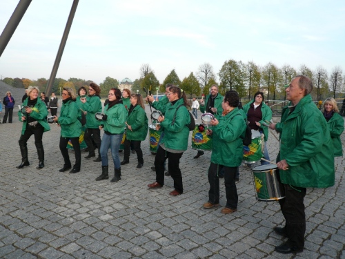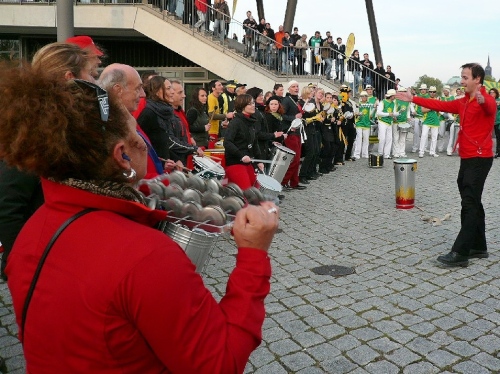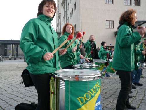 Vor dem ICC unterhalten mittlerweile zwei Sambagruppen die zahlreichen Zuschauer. Abwechselnd trommeln beide Bands. Ich weiß nicht, ob es geplant ist, denn nach kurzer Zeit sind fünf Gruppen versammelt. Und die spielen später in einer richtigen Session miteinander. Das macht Vorfreude auf den Lauftag.