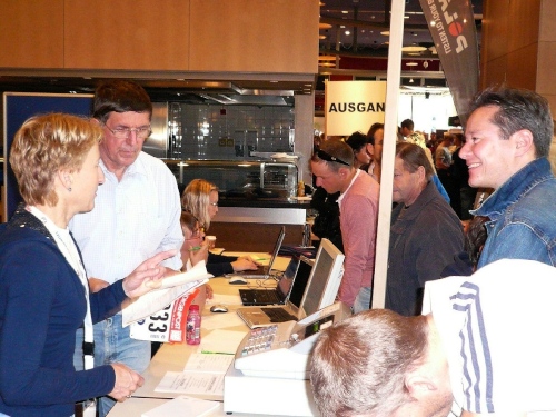 Klar, dass auf die Abgabe der Startunterlagen nicht lange gewartet werden muss. Viele engagierte Helfer stehen hinter der Theke. Die Abgabe ist getrennt nach den Streckenlängen (Marathon, Halbmarathon, 10 Kilometer) und dort noch nach Voranmeldern und Nachmeldern. Wer sich noch weiterbilden möchte, der kann das beim 2. Laufmedizinischen Symposium tun.