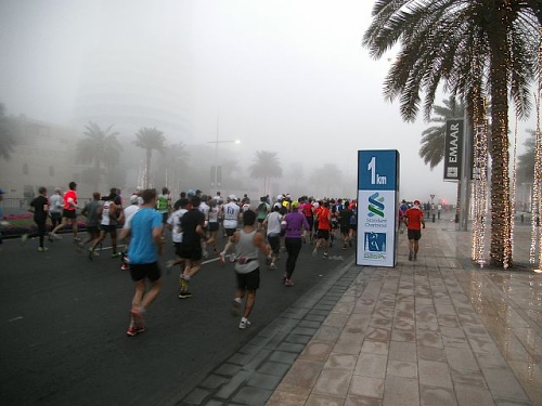 Doch nun weg von den Gazellen, hin zu den Läufern. Am Start war es sehr nebelig und nur 18 Grad warm. Normalerweise ändert es sich recht schnell und es wird kurz nach 7 Uhr schon recht warm, doch heute blieb es fast bis um 9 Uhr nebelig und recht angenehm von den Temperaturen. Also erst mal in aller Ruhe losgetrabt und den Durj Khalifa bewundert (bin übrigens am nächsten Abend (22 Uhr) mal hochgefahren und habe die nächtliche Aussicht bewundert, einfach beeindruckend). Dann führt uns die Strecke rund um die Dubai Mall, das zweitgrößte Einkaufszentrum der Welt mit 1.200 Geschäften, die 37 Millionen Besucher pro Jahr anziehen sollen.