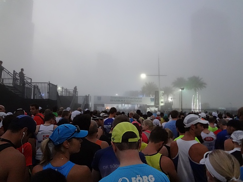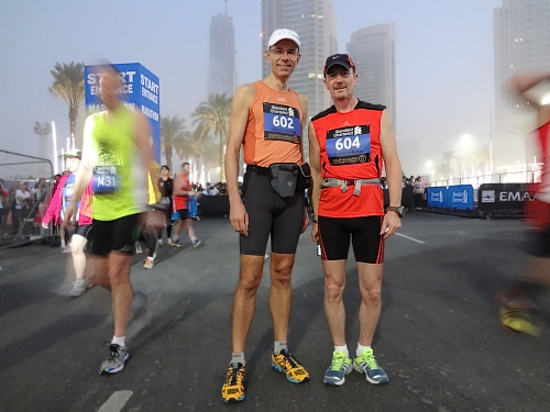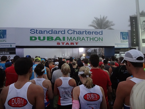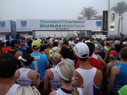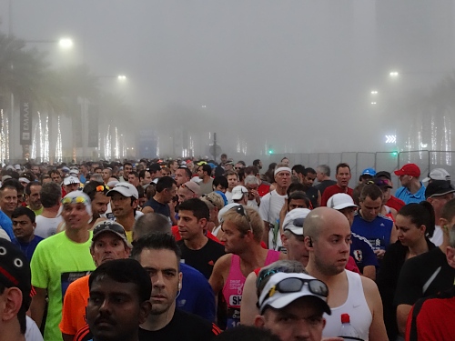 Stockdunkel ist es noch, als wir 35 Minuten vor dem Start vor’s Hotel treten. Feuchter Nebel schleicht sich in die Stadt. Bis die Garmins die Satellitenverbindungen zustande gebracht haben, beginne ich mit den Zähnen zu klappern. 12 Grad sollten nach den eisigen Januartagen in der Schweiz doch warm erscheinen! Bewusst hatten wir mit dem Al Murooj Rotana ein Hotel gewählt, von dem Start und Ziel zu Fuss erreichbar sind. 2011 waren wir auf der Anfahrt zum Lauf mit dem Taxi in einen zähen Stau geraten. Schlussendlich hatten wir dieses auf der Autobahn verlassen, um auf dem Pannenstreifen mindestens einen Kilometer zum Startgelände zu hetzen.