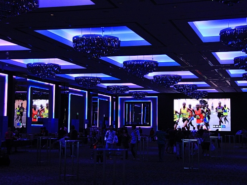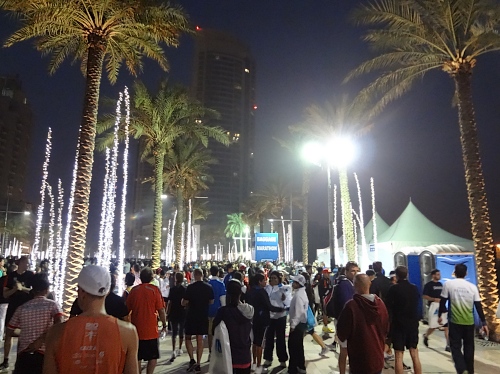 Auf dem grosszügigen Fussgängerweg entlang des runden Sheikh Mohammed Bin Rashid Boulevards wollen wir bis zum Start einlaufen. Kurzes Traben muss schliesslich reichen. Wir haben nicht mit dem Gedränge der 11'000 Zehn-Kilometer-Läufer gerechnet. Sie werden um 7:15 Uhr starten und sind gleichzeitig auf dem Weg zu ihrem Startsektor. Einen Moment haben wir Bedenken, den Eingang ins Marathon-Feld rechtzeitig zu finden. Es ist zeitaufwändig, sich zwischen den festlich beleuchteten Palmen, Zuschauern, Begleitern und Läufern aus aller Welt hindurch zu schlängeln. Zehn Minuten bevor es los geht, stehen wir doch an der richtigen Stelle. Und wir haben gar keine Zeit, vor dem Start nervös zu werden!