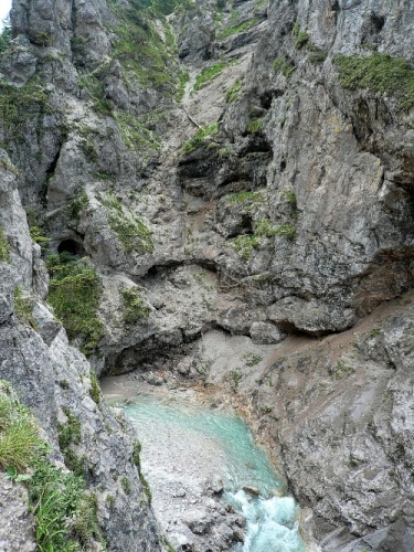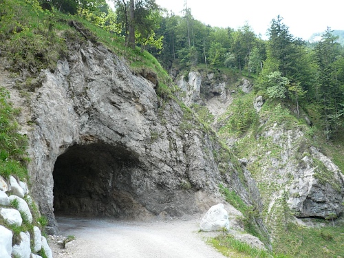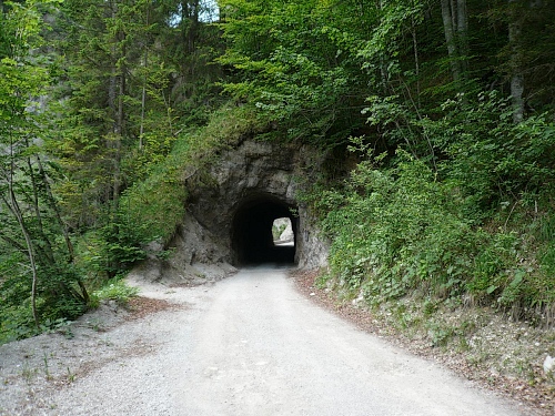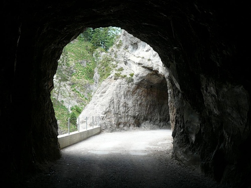 Die breite Straße in Kaisertal steigt später leicht an und der Kaiserbach tost unten in der Tiefe. An einem kurzen Tunnelstück ist das tosende Wasser tief unten zu sehen. Bestimmt 50 Meter geht es da hinunter.