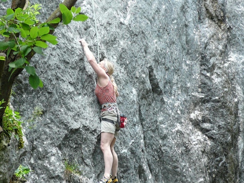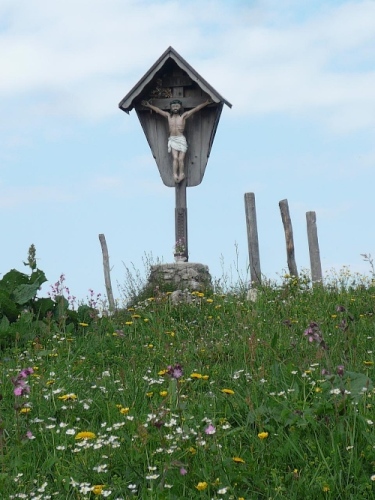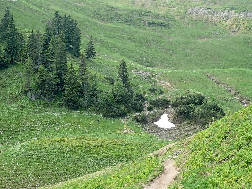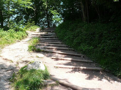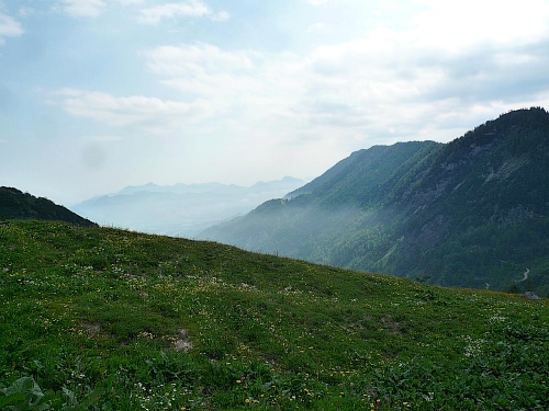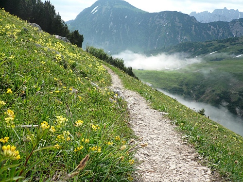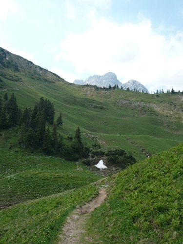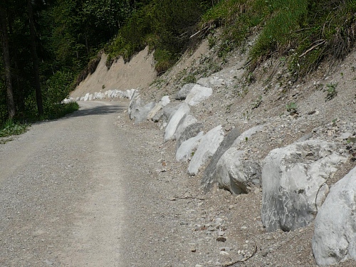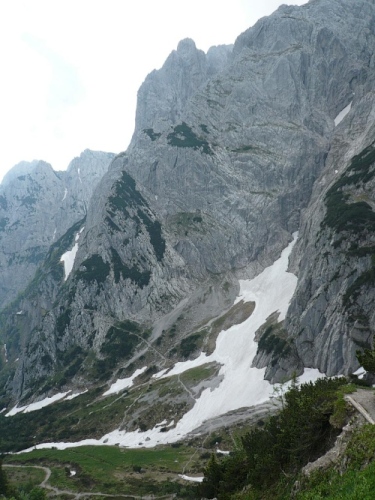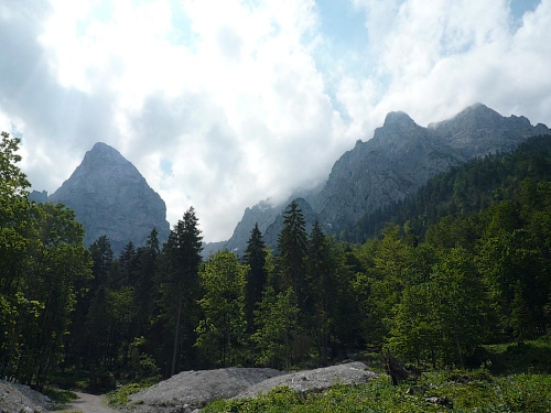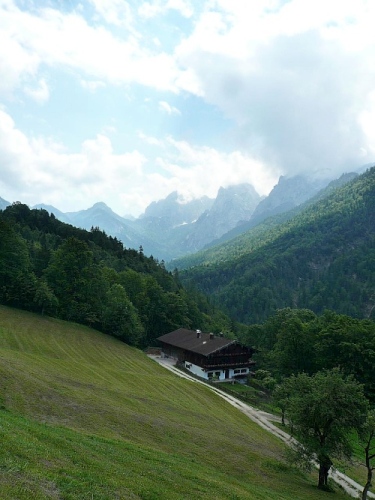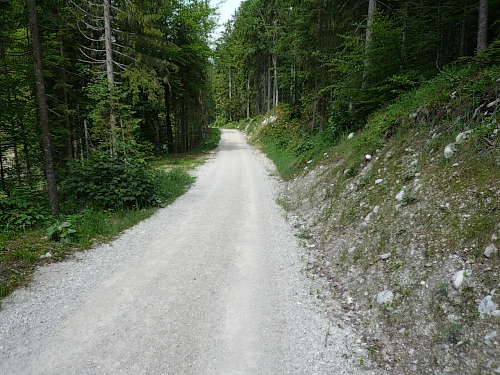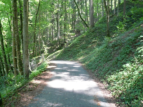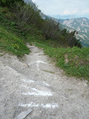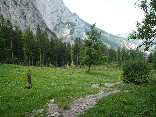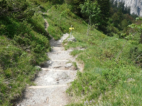 Der Rückweg ins Kaisertal wartet mit unzähligen Treppenstufen auf. Gut, dass der Boden trocken ist. Aber Konzentration ist nötig, da die Stufen unregelmäßig hoch sind. Eine halbe Stunde dauert der Abstieg, dann bin ich im Kaisertal (auch Sparchental genannt) angekommen. Das Tal trennt den Zahmen vom Wilden Kaiser und fällt Richtung Westen zum Inn und Kufstein hin ab. Erst vor wenigen Jahren wurde das Tal mit einer Straße erschlossen. Bis dahin war die Versorgung der Gäste und Einwohner umständlich. 285 Stufen zählte der am häufigsten benutzte Zugang bei Eichelwang. Den werde ich noch bei meinem langsamen Läufchen besichtigen. Laufen geht nun wieder, da der Weg besser und breiter geworden ist.