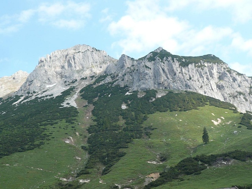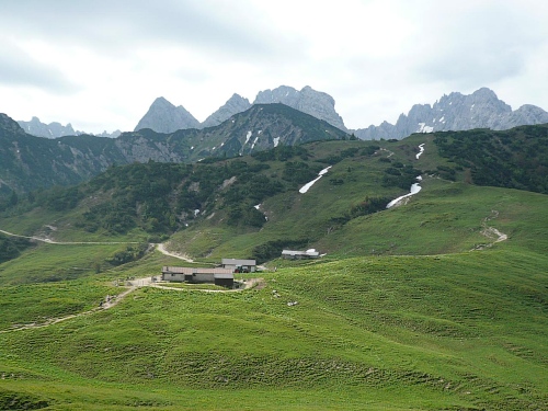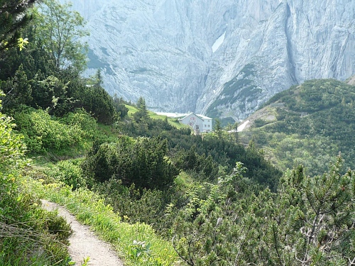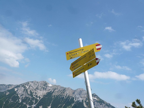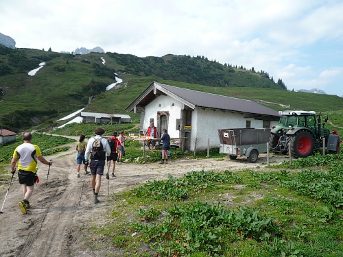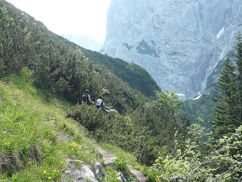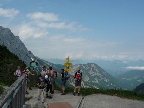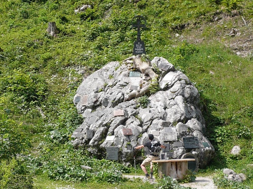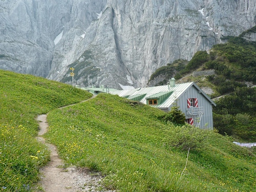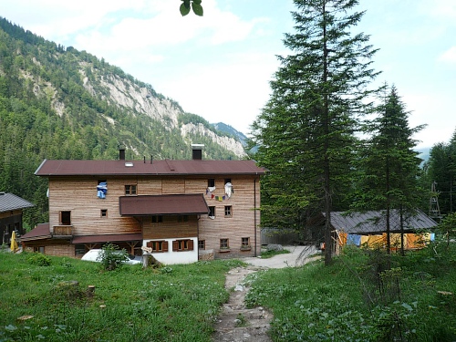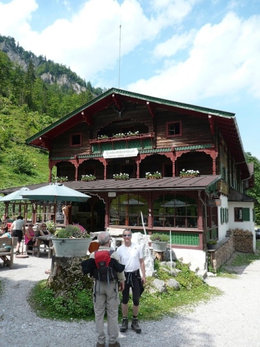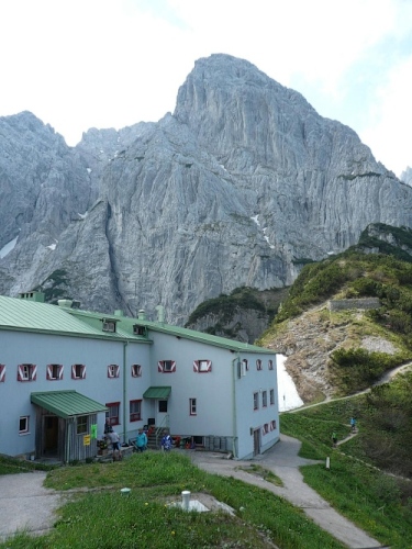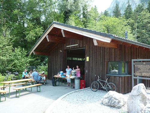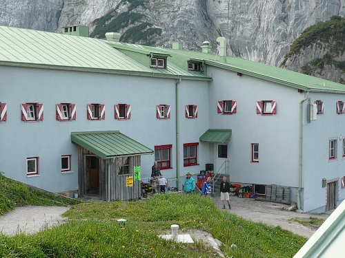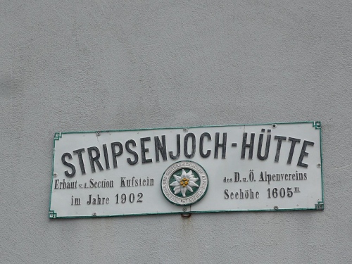 Das Haus liegt in direkter Nähe zum Stripsenjoch, das ist der Übergang vom Kaisertal zum Kaiserbachtal. Kletterer und Wanderer haben hier eine zentrale Stelle für ihre Unternehmungen. Den Kraxler zieht es daher gerne zur Ellmauer Halt (2344 Meter) oder zur Fleischbank, den trittsicheren Wanderer zur Steinernen Rinne und zum Ellmauer Tor. Am Stripsenjochhaus treffe ich einen alten Bekannten, den Franz Steichele, den ich in den vergangenen Jahren nach Füssen und Frauenfeld mitgeschleift habe. Hier wird wiederum verpflegt und dann mache ich mich auf den Rückweg. Eine Stunde dauerte mein Marsch von der Hochalm bis hierher.
