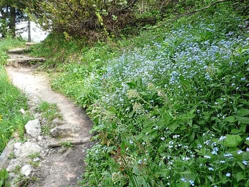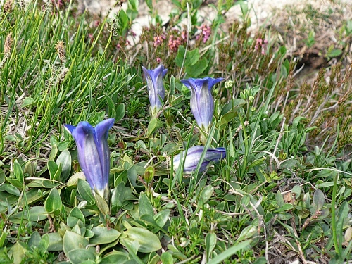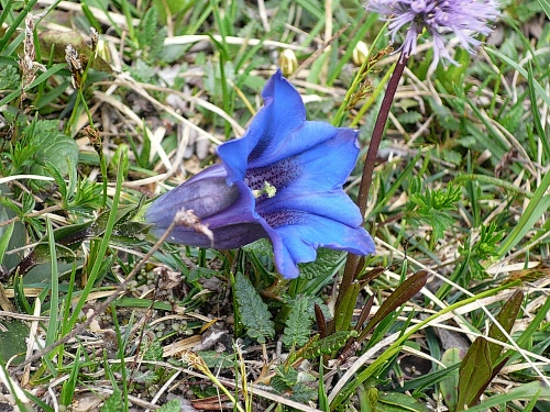An der Hochalm (1403 Meter) ist eine weitere Trinkstelle eingerichtet. Gegen 09.30 Uhr schnappe ich mir zwei Becher und mache mich auf den Weiterweg nach Süden. Die Nebelbänke aus dem Kaiserbachtal (jenseits des Höhenüberganges) haben sich mittlerweile verzogen. Wir müssen über zwei größere Höhenrücken hinweg, dann sehen wir überraschend die Stripsenjochhütte (1605 Meter) auftauchen. Einen schönen Anblick bieten mir die wenigen, aber dafür umso fetter dastehenden Enzian.