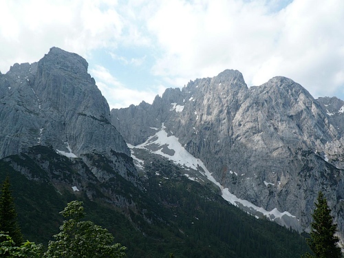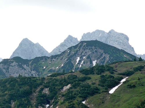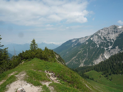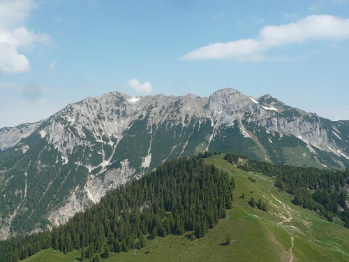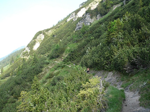 Der Kurs führt uns auf dem Höhenweg Richtung Osten. Der Wilde Kaiser ist immer im Blick. Zur Hochalm wird meist marschiert, laufen ist auf einer Höhe zwischen 1400 Meter und 1600 Meter immer nur ein paar Meter möglich. Zum Teil geht es kurze Stücke durch Geröll, dann wieder im Schatten durch Nadelhölzer oder Latschen, aber immer auf und ab, es macht richtig Spaß. Einige Wegabzweige führen ins Kaisertal hinab oder hinauf auf die Gipfel des Zahmen Kaisers, wie zum Einserkogel (1924 Meter), Zwölfer- oder Elferkogel (1916 Meter). Es wartet sogar ein kleines Altschneefeld, wo einige nach unten ausweichen. Ja, auf diesen Untergrund braucht es griffige Schuhe, ein Ausrutscher kann einen schnell in eine brenzlige Situation bringen.