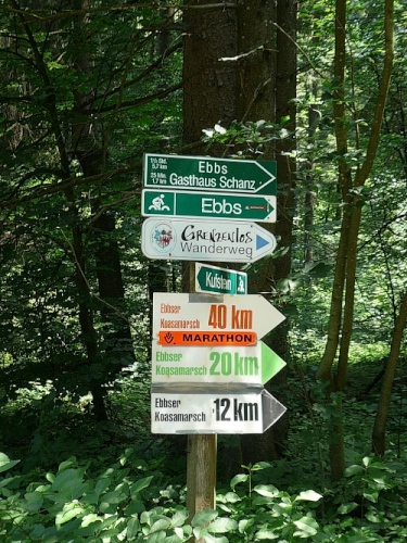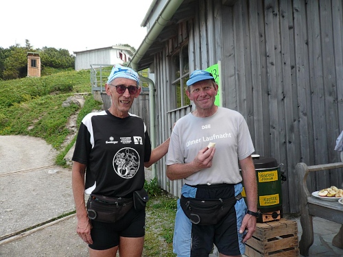 Am Kaiseraufstieg stößt nun die zwölf Kilometer-Strecke wieder zu uns und da ist eine weitere V-Stelle. Die am Morgen erarbeiteten Höhenmeter haben wir zur Gänze zurückbekommen. Ich schnappe mir einen Becher Tee und mache mich auf die letzten fünf Kilometer, die zum großen Teil schön schattig im Wald verlaufen. In der Sonne ist es nun mittlerweile brandheiß geworden. Die letzten Meter verlaufen durch Oberndorf und Ebbs bis zum Festzelt am „Hallo Du“ Freizeitzentrum. Dort spielt eine Blaskapelle im gut besuchten Festzelt.