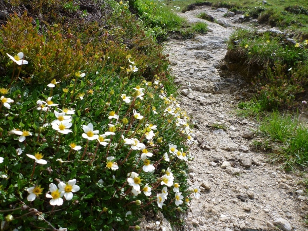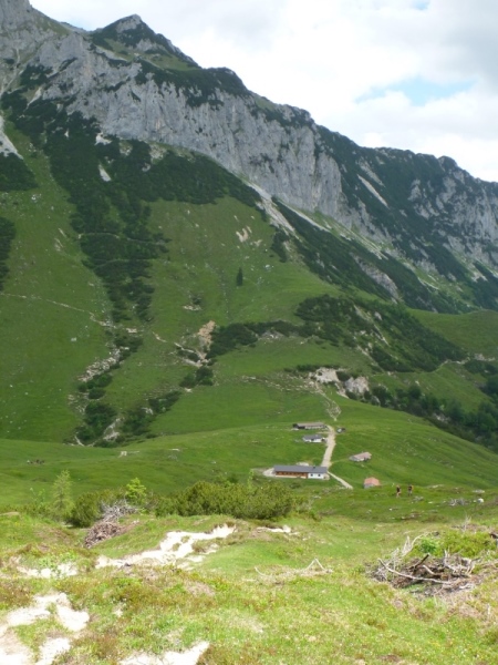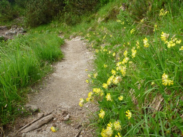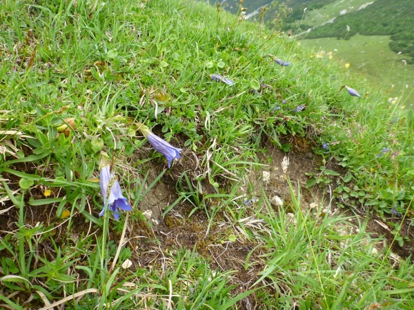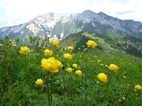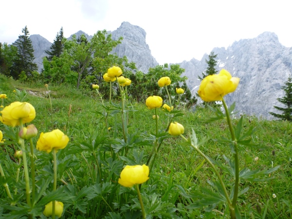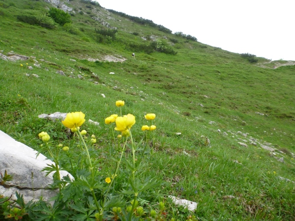 Wir müssen über zwei größere Höhenrücken hinweg, dann sehen wir überraschend das Stripsenjochhaus (1605 Meter) auftauchen. Einen schönen Anblick bieten mir die wenigen Enziane. Ein wenig durstig schauen die heute aus. Dagegen stehen auf dem letzten Höhenrücken die Trollblumen richtig im Saft.