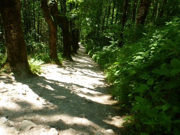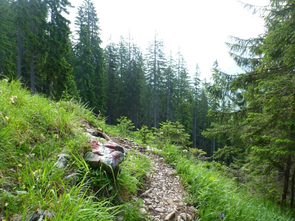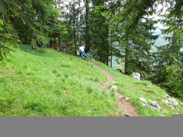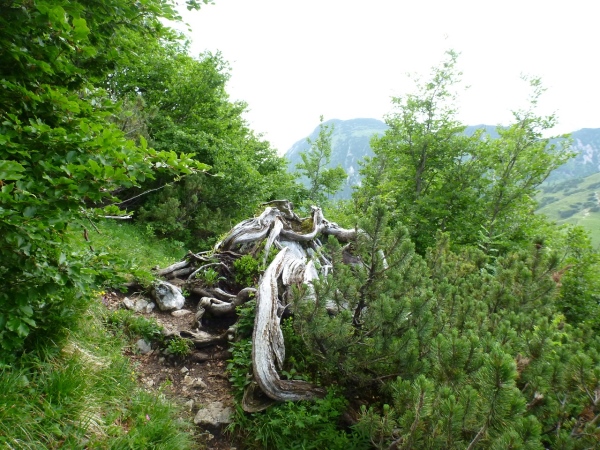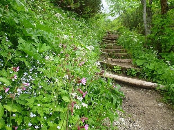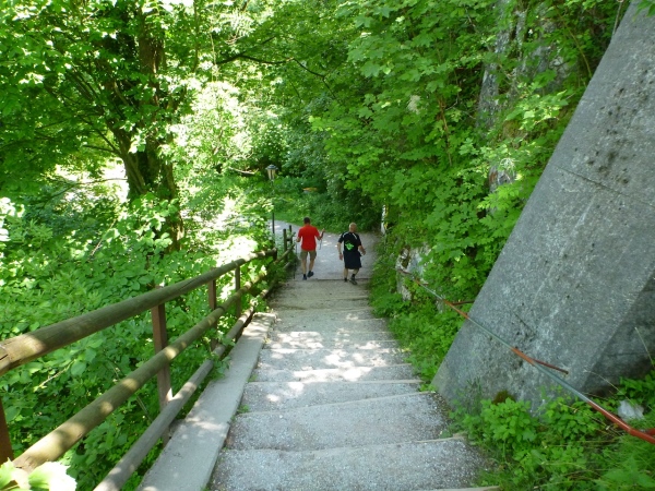 Um 12.15 Uhr trete ich den Abstieg ins Richtung Kaisertal an. Unzählige Treppenstufen warten auf den Wanderer. Sobald der Wanderweg in den Schatten führt, sind die Holzstufen teilweise noch feucht und glatt, also sollte man nicht unbedingt drauf steigen. Gut 30 Minuten ist höchste Konzentration nötig.
