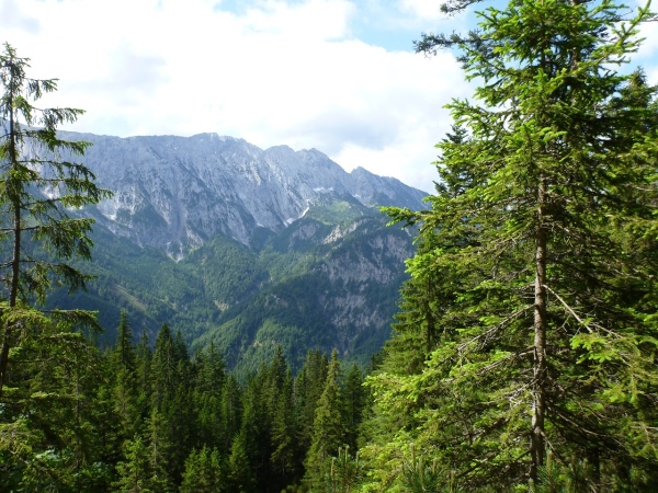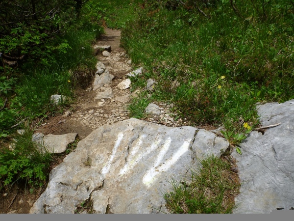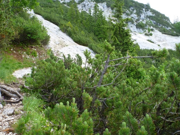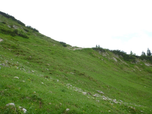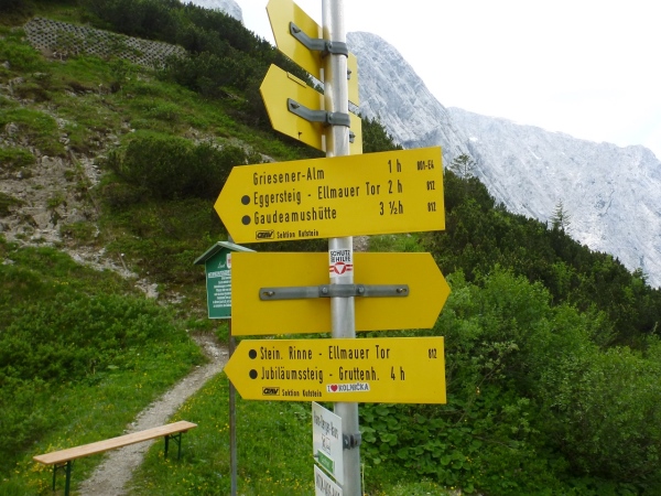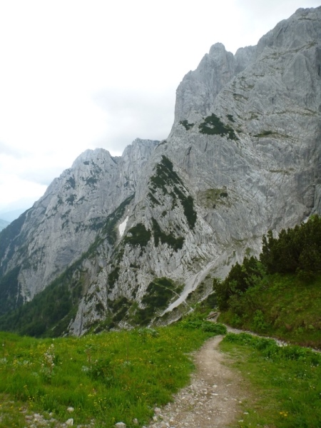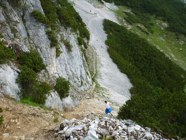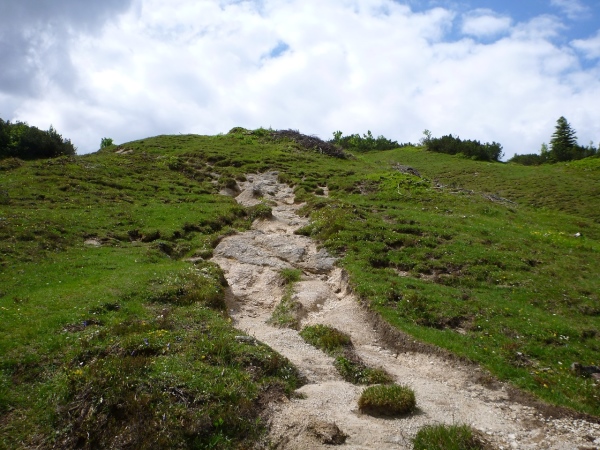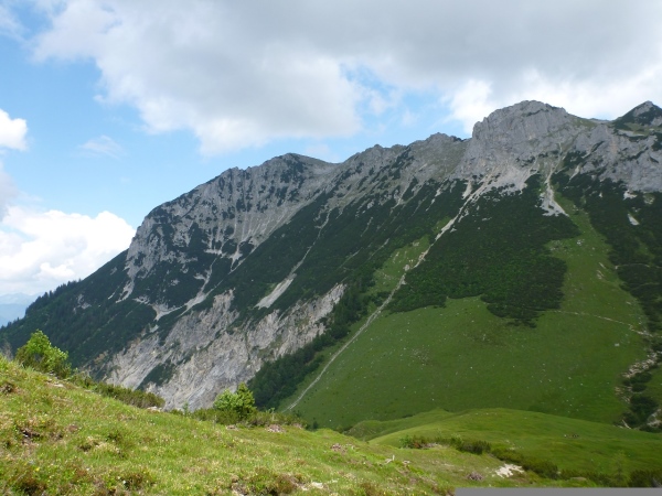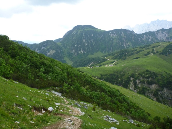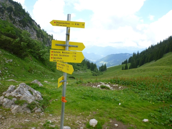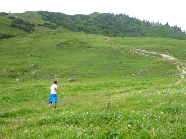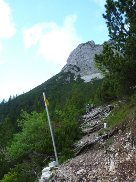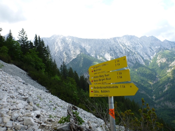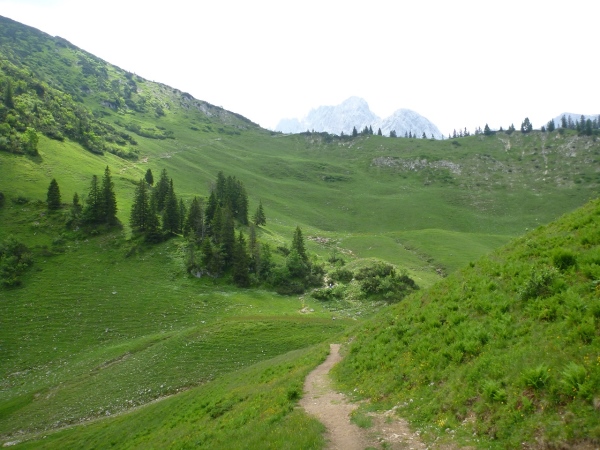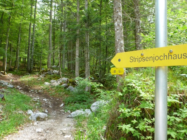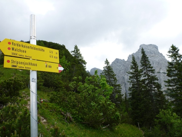 Vier Stunden zeigt der Wegweiser zum Stripsenjochhaus an, ich bin gespannt, wie lange ich dafür brauche. Der Trail wird wieder sehr schmal und führt Richtung Osten auf dem Höhenweg. Der Wilde Kaiser ist immer im Blick. Zur Hochalm wird meist marschiert, laufen ist auf einer Höhe zwischen 1400 Meter und 1600 Meter immer nur ein paar Meter möglich. Zum Teil geht es kurze Stücke durch Geröll, dann wieder im Schatten durch Nadelhölzer oder Latschen, aber immer auf und ab, es macht richtig Spaß.