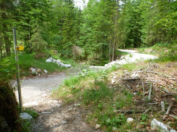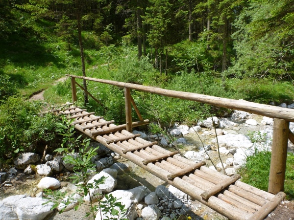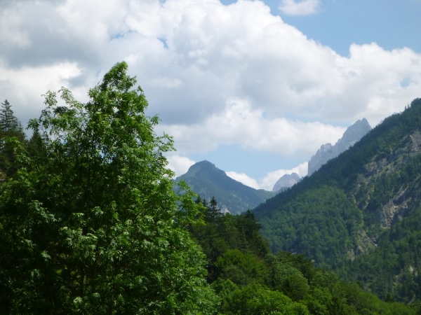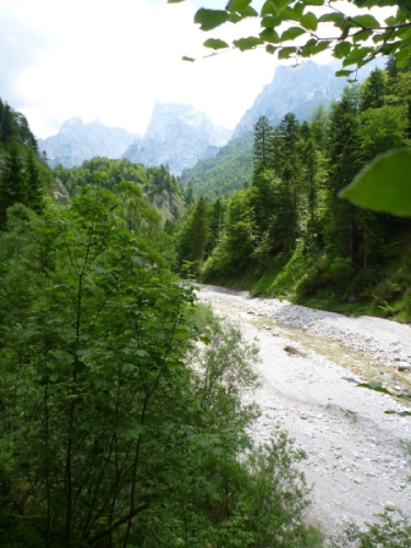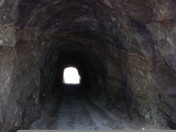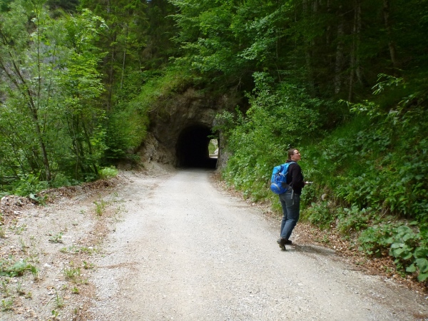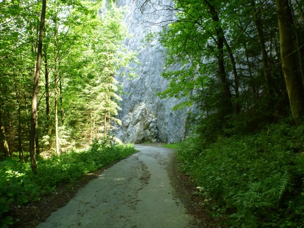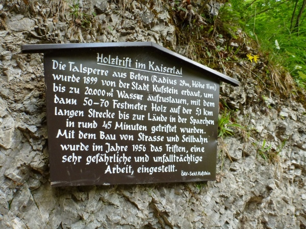 Die breite Straße in Kaisertal steigt später leicht an und der Kaiserbach tost unten in der Tiefe. An einem kurzen Tunnelstück ist das brodelnde Wasser tief unten zu sehen. Bestimmt 50 Meter geht es da hinunter. Früher hat man da Holztrift betrieben, seinerzeit eine gefährliche Arbeit.