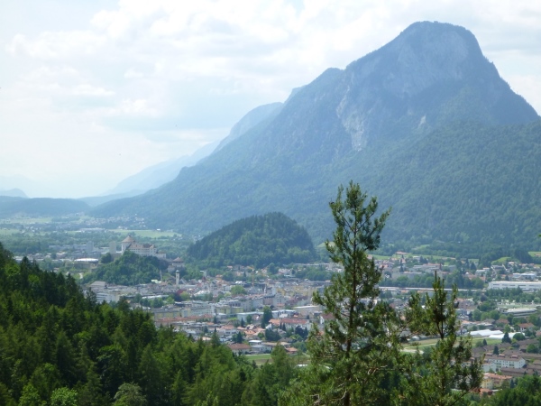 Die Berge auf beiden Seiten flachen immer mehr ab, Kufstein mit dem Inntal kommt immer mehr ins Blickfeld. Einkehrmöglichkeiten bieten der Pfandlhof und Veitenhof. Immer wieder kann ich vereinzelte Wanderer überholen. Die 20 Kilometer-Strecke mündet ein. Etwa 200 Meter Höhendifferenz und 280 Stufen müssen auf dem Abstieg bei Eichelwang geschafft werden, dann erhalten wir unweit des Holzplatzes der Stadt Kufstein die letzte Tränke. Ein Becher Wasser muss mir für die restlichen sechs flachen Kilometer genügen.