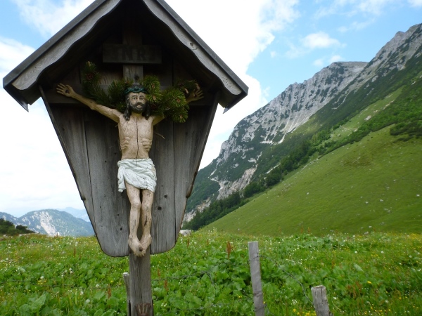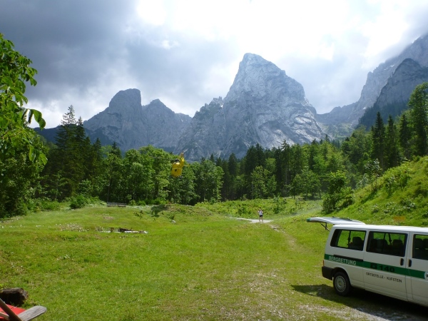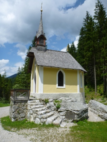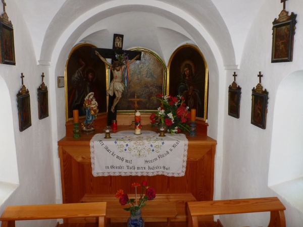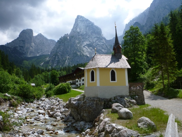 Bereits auf 839 Meter liegt der Talschluss Hinterbärenbad mit dem Anton-Karg-Haus. Der ÖAMTC-Hubschrauber landet hier in unmittelbarer Nähe, nimmt weiteres Material für den laufenden Einsatz auf und fliegt davon. Das Anton-Karg-Haus ist bewirtschaftet, man kann übernachten und für Tagesausflügler ist es in zwei bis drei Stunden einfache Entfernung zu Fuß erreichbar. Ich trinke zwei Becher und mache mich wieder auf den Weg, doch für eine kurze innere Einkehr in der Kapelle „Maria auf dem Stein“ finde ich Zeit.