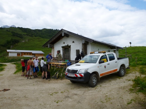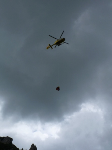 Kurz vor dem Abstieg zum Stripsenjochhaus ist ein gelber Rettungshubschrauber des ÖAMTC zu sehen. Dessen Geknatter kam schon einige Zeit aus Richtung Wildem Kaiser. Entweder hatten die einen scharfen Einsatz oder es war nur Übung oder ein Versorgungsflug zur Hütte. Der Helfer an der Stempelstelle berichtet mehr. Ein Bergsteiger braucht Hilfe und deswegen hängen einige Helfer der Bergrettung longline unten am Helikopter und lassen sich an die Einsatzstelle fliegen.