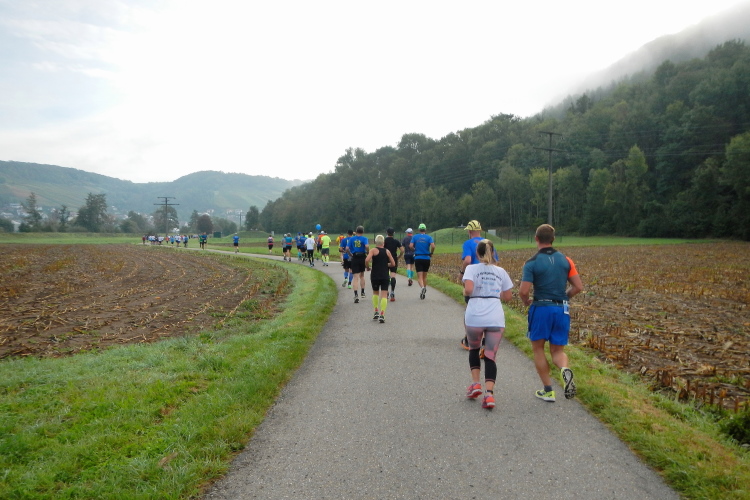 In einem Auf und ab geht es zwischen den reifenden Trauben in Richtung Ausgangspunkt. Auf der anderen Talseite ist das Start- und Zielgelände bei den Sportanlagen Niedernhalls und die Musik klingt von dort bis hierher. 15 Kilometer der Strecke liegen hinter mir und vor mir der nächste Verpflegungsposten und die Wechselzone des Duomarathons. Auf der alten Strecke lief das erste Mitglied der Zweierteams den längeren Teil, nun übernimmt das zweite diese Aufgabe. Nachdem ich das Höhenprofil auf der Website nur flüchtig angeschaut habe, bin ich der Meinung, dass mit -Ausnahme einer Steigung gleich zu Beginn des längeren Teilstücks - im Sinne eines gerechten Ausgleichs die größere Anzahl Kilometer mit weniger Höhenmetern gespickt ist.