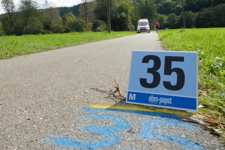 Die neue Streckenführung bringt uns umgehend zurück zum Startbereich und talaufwärts. Auf mir bekanntem Fahrradweg geht es zu einem sauberen Gewerbegebiet und weiter nach Ingelfingen. Wer das Verlangen und die Kondition dazu hat, kann auf diesem flachen Straßenstück Dampf machen. Nach viereinhalb Kilometern ist die erste Verpflegungsstation aufgebaut.