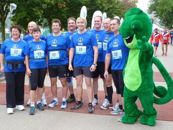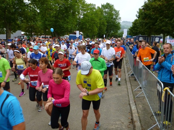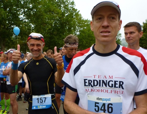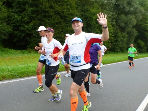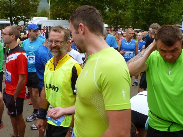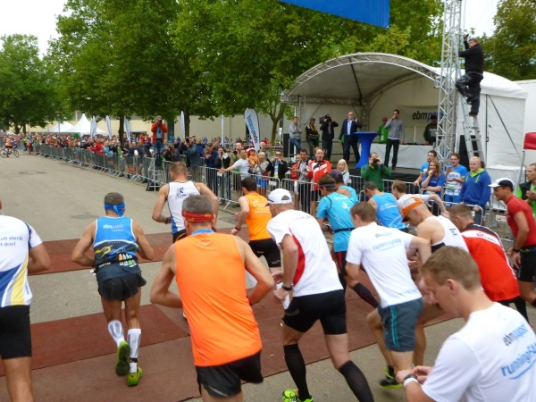 Auch vor unserem Start um 08.30 Uhr verläuft alles unaufgeregt. Sei es bei der Gepäckabgabe, in den Umkleiden oder bei der allerletzten Ent- äääh Besorgung, keine Hektik und keine Drängelei. Das geht dann so weit, dass die Spitzenläufer noch an die Startlinie gebeten werden müssen. Doch dann kommt der Countdown und Rainer Hundsdörfer, Vorsitzender der Geschäftsführung, schießt uns auf die Strecke. Die Marathonis und die Teams beginnen den sportlichen Tag nach dem Läufergottesdienst. Knapp 150 Marathonis und 50 Teams machen sich auf den Weg. Die Teams teilen sich den Marathon zu zweit auf (27 Kilometer und 15 Kilometer), eine gute Gelegenheit, hinein zu schnuppern.