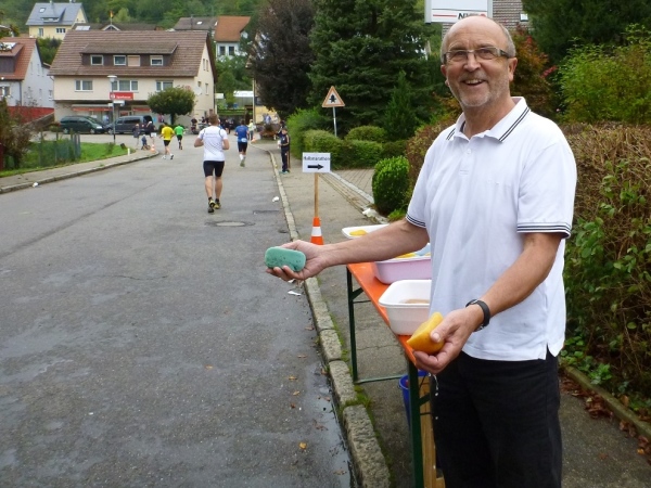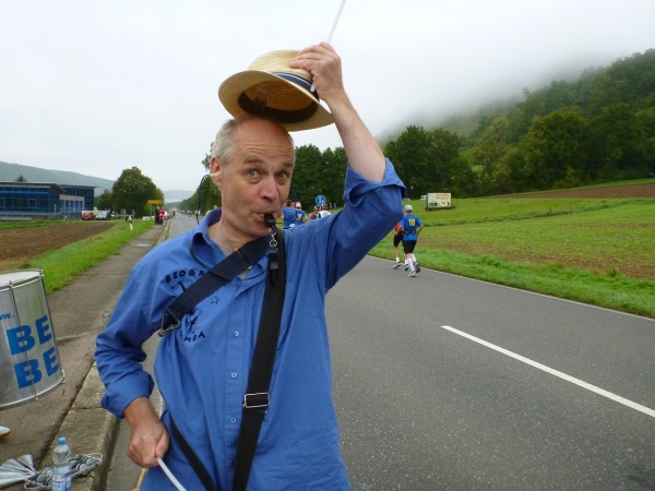 In Ernsbach überqueren wir den Kocher, am Ende der Straße wartet mit ReBeat eine weitere Band. Der Bandleader schneidet mit Pfeife im Mund und Trommelstöcken in den Händen eine Grimasse, worauf mir vor lauter Lachen fast die Kamera aus den Händen fällt. Hier ist die Streckentrennung. Die Halben gehen gleich nach rechts und wir holen uns sechs Kilometer beim Wendepunkt in Sindringen. Von den Halbmarathonis ist jetzt noch nichts zu sehen, sie starten vierzig Minuten nach uns.