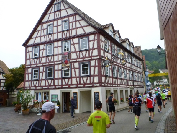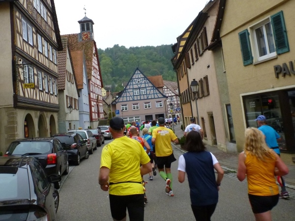 Auf dem Brückenwiesenweg stehen die Zuschauer noch dicht an dicht und nach wenigen Metern durchlaufen wir die Altstadt. Knapp 4000 Einwohner zählt Niedernhall, die ihren Namen einer Salzquelle verdankt. Die erste urkundliche Erwähnung datiert aus 1037. Die aus dem 14. Jahrhundert stammende Stadtmauer umschließt den Stadtkern zum größten Teil noch heute. Der 30jährige Krieg, die Kriege im Mittelalter und auch die beiden Weltkriege im 20. Jahrhundert überstand das Bauwerk ohne große Blessuren.