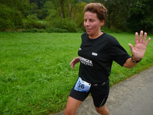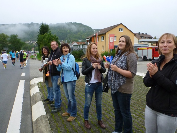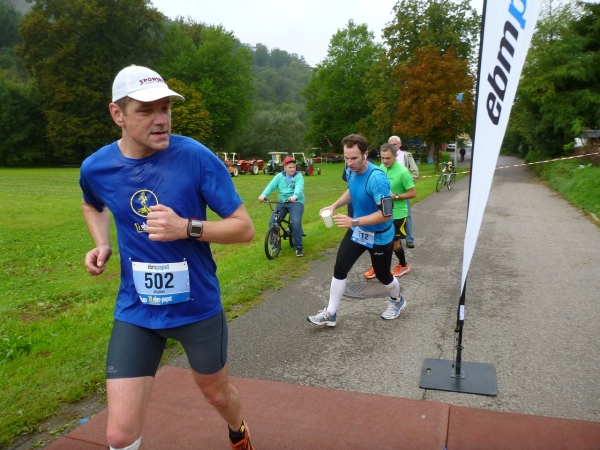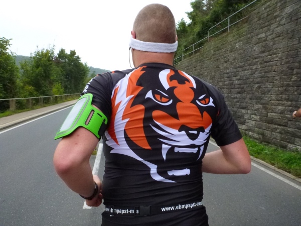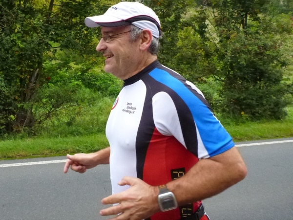 Die Höhendifferenz bekommen wir gleich zurück und laufen gefällig nach Weißbach hinein. Die Trommelgruppe Percussion Abusua gibt uns den nötigen Drive für die nächsten Kilometer. Olaf Schmalfuß gibt gleich zu, dass er etwas zu schnell begonnen hat, als ich auf ihn auflaufe. „Außerdem bist du ein Jungspund und ich darf als Älterer langsam machen“, darf ich mir anhören. Ich werde mich später mit einem Kampfbild auf seinen letzten Kilometern revanchieren.