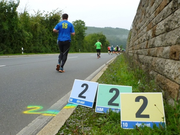 Eher etwas verhalten habe ich mein Tempo gewählt, denn letzte Woche in der Fränkischen Schweiz bin ich auf den letzten Kilometern eingegangen und das soll heute nicht passieren. So ist der 4-Stunden-Läufer in Sichtweite hinter mir. Ein weiterer Pacer mit Ziel 3.30 ist schon gar nicht mehr zu sehen. Es ist mit rund 16, 17 Grad nicht kalt, es sind eher gute Bedingungen für einen schnellen Lauf, zumal kein Wind stört. Im Tal hängen noch letzte Wolkenreste, die sich langsam auflösen.