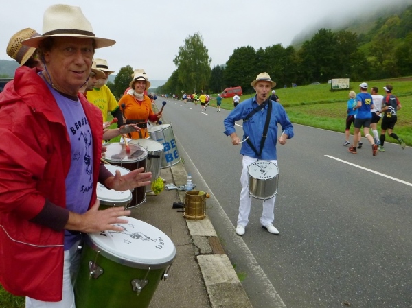 Auffallend viele Sanis stehen am Laufkurs. Sie sind nicht nur bereit, wenn nötig Hilfe zu leisten, sondern haben für uns auch freundliche Worte der Aufmunterung oder ein Klatschen parat. Danke. Sowohl in Forchtenberg als auch in Ernsbach, der nächsten Ortschaft, sind die Sambabands ein Zuschauermagnet.