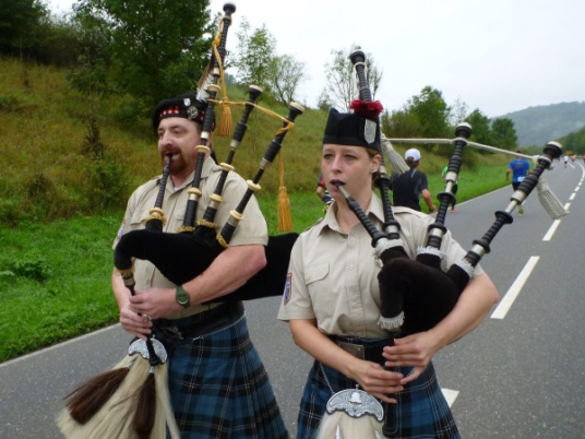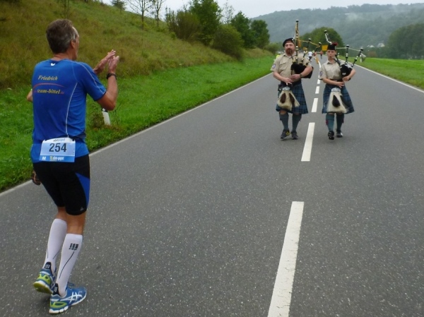 Dann ist Musik zu hören, jedoch noch nichts zu sehen. Friedrich Franz vom Team Bittel, mit dem ich einige Kilometer Seite an Seite laufe, glaubt, die Musikanten stehen oberhalb der Straße. Doch dann kommen uns zwei Dudelsackpfeifer in schottischer Tracht auf dem Mittelstrich der Hauptstraße entgegen.