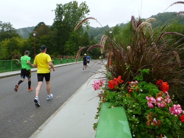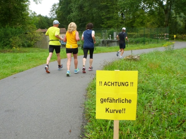 Wir überqueren den Kocher und dann wartet auf der Kochertalstraße die erste und gleichzeitig schwerste Steigung. Über die rund 20 Höhenmeter kann ein Bergläufer nur lachen, aber einige Mitläufer schwitzen schon wie die Bären.