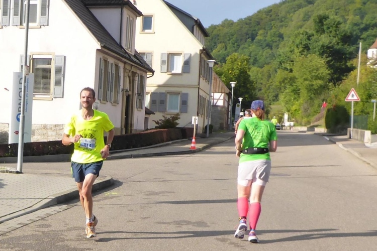 Es geht links, eine Schleife bringt uns mitten in die abgesperrte Altstadt. Hier ist es vergleichsweise ruhig und wir können die schönen alten Fachwerkhäuser bestaunen. Auch die Stadtmauer aus dem Jahr 1363 ist noch gut erhalten und umschließt an drei Seiten den Stadtkern. Wir passieren das Rathaus mit seiner imposanten Freitreppe aus dem Jahre 1477. Es zählt zu den besterhaltenen historischen Bauwerken in ganz Franken. Das Götzenhaus, ein beeindruckendes Fachwerkgebäude am Ufer der Kocher, war in früherer Zeit Schulhaus und ist nach seinem bekanntesten Schüler, Götz von Berlichingen, benannt. Auf der für den Verkehr gesperrten Brücke gelangen wir über die Kocher und dann links auf der L1045, Richtung Weißbach. Die Steigung ist moderat und auch für mich noch laufbar.