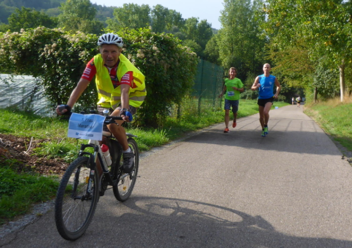 Mich verwundert das Regiment an gefüllten Bechern, das auf den Tischen bereitsteht. Klar - die Helfer bereiten sich auf den Sturm der Halbmarathonis vor. Ein paar Meter weiter, an der großen Kreuzung, wird wieder getrommelt. An dieser Stelle zweigt der Marathon links auf eine Wendepunktstrecke ab. Die ersten Marathonläufer kommen bereits zurück. Auch der Führende des Duo-Marathons wird angekündigt. Es geht auf einen Radweg Richtung Sindringen. Zunächst einzeln, dann auch mal in kleinen Gruppen kommen die schnelleren entgegen. Wie weit sie wohl voraus sind? Da kommt das Fahrrad der führenden Frau. Zwei blonde Zöpfe wehen mir entgegen. Christine Sigg-Sohn ist schnell unterwegs.