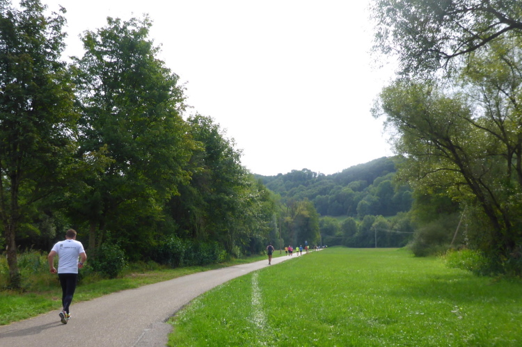 Jetzt mache ich erst einmal ein Päuschen an der VP und genieße den Rummel, den die Trommler veranstalten. Die Strecke führt zunächst in den Ort hinein, und dann rechts haltend wieder hinaus auf einen Radweg. Dieser führt parallel zur Straße, die wir anfangs gekommen sind, zurück Richtung Niedernhall, allerdings auf der anderen Seite der Kocher. Zwischen den Feldern ist es wesentlich angenehmer zu laufen. Vielleicht liegt mein positives Gefühl aber auch an den Wolken, die sich mittlerweile vor die Sonne geschoben haben oder aber am nun wieder dichteren Läuferfeld. Auf jeden Fall ist es schön hier zu laufen. Die Halbmarathonis sind tendenziell etwas langsamer und so kann ich mich vorarbeiten.