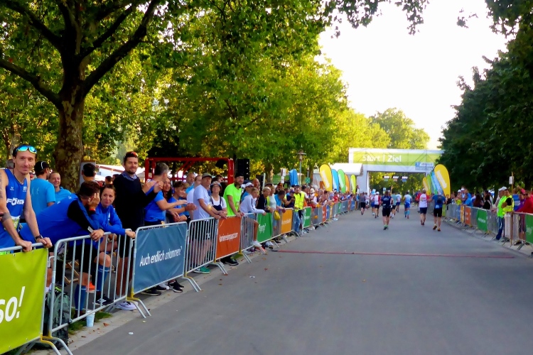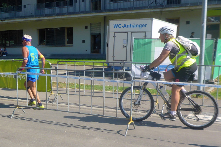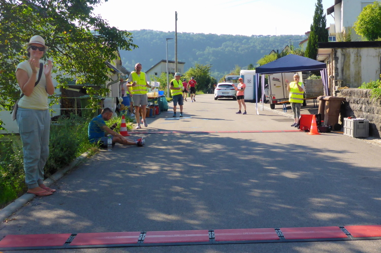 Hinter einer Schrebergarten Kolonie und vor dem Turm geht es rechts auf die halbseitig gesperrte Straße. Die Streckenposten bieten noch ein außerplanmäßiges Getränk. Dann geht es schattenlos an der Mauer entlang den Berg hoch und links in die Stadt. Die Hauptstraße wird überquert. Ein letzter Dank an die Polizisten, die den Verkehr für uns regeln. Spaziergänger feuern uns an. Eine weitere Linkskurve wieder runter Richtung Kocher mit motivierenden Anfeuerungen der Helferin und dann rechts zum Veranstaltungsgelände.