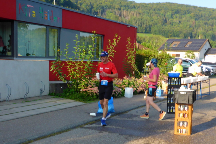 Der Radweg ist schmal, und meist schattenlos, entschädigt aber mit schöner Natur. Hinter km 29 erreiche ich das nächste Wohngebiet. Ich bin zurück in Neuwülfingen, km 30. Rechts unter eine Brücke, hinten hinauf, ich erkenne die VP mit der folgenden Streckentrennung von 1. und 2. Runde wieder. War es vorhin noch der Ballermann, so ist man jetzt musikalisch gerade beim Stadionhit „Sweet Caroline“ gelandet. Nach zwei Bechern Cola bin ich bereit, den Song lauthals mit zu schmettern (sorry Neil Diamond). Die angebotene Dusche nutze ich in vollen Zügen.