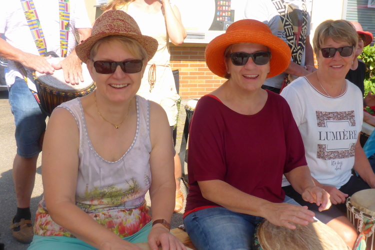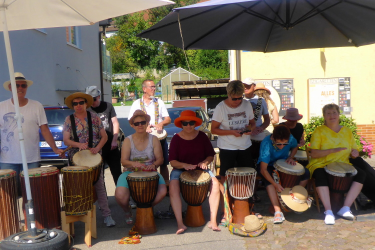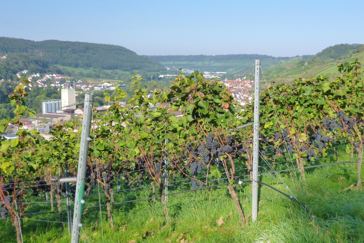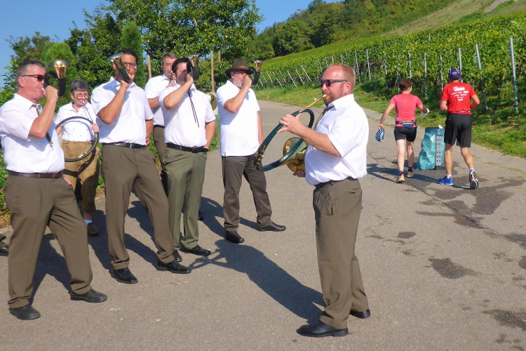 Wir sind uns einig, dass bergauf gegangen wird, obwohl die Musik von oben uns magisch anzieht. Dort werden wir auch überschwänglich empfangen. „Wasser oder Iso?“ rufen die Helfer schon von weitem. Die Umpferpforzter Guggenmusiker aus Boxberg, heute anstatt in bunten Kostümen in elegantem Schwarz gekleidet, machen Stimmung. Wir sind begeistert von diesem Konzert nur für uns im Weinberg. Ingelfingen und das halbe Kochertal liegt uns zu Füßen.