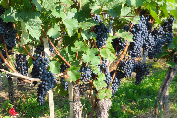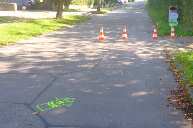 Anschließend geht es wellig im Weinberg dahin, km 9. Die Reben hängen voll mit blauen und weißen Trauben. Es scheint eine gute Ernte zu geben. Ein rasanter Abstieg zurück ins Tal bringt uns auf die Bühlhofer Straße, die wir, von Polizei gesichert, überqueren. Während meine Begleiter das obligatorische Foto bei km10 machen, laufe ich schon mal weiter.
