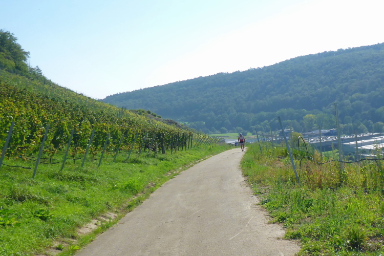 Ein paar Bäumen sei Dank ist es angenehm schattig, aber die Weinberge im Hintergrund liegen bereits in der Sonne. Eine kleine Steigung nutze ich zum Gehen. Ich höre Schritte von hinten. Friederike und Manfred laufen zu mir auf. Die beiden kommen aus der Nähe von Nürnberg und haben die Strecke für Friederikes ersten Marathon ausgesucht. Der erfahrene Ultraläufer Manfred wird sie sicher ins Ziel bringen.
