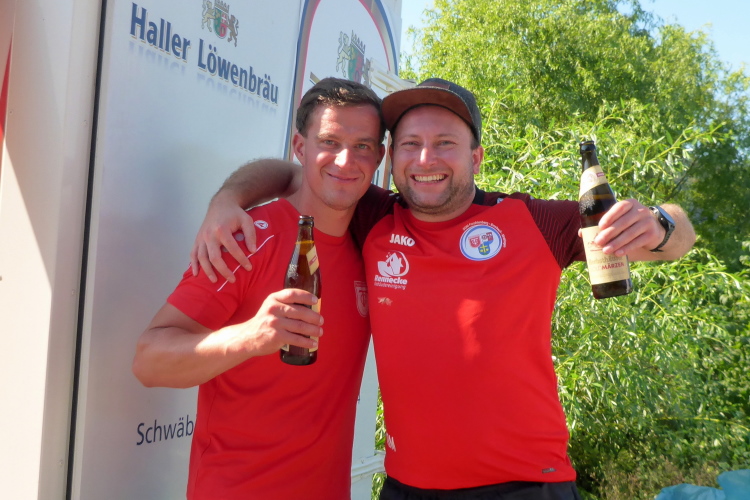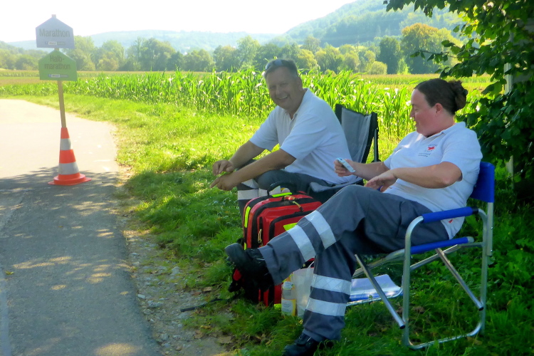 Die Jagdhornbläser aus Künzelsau machen gerade Pause. Als unser froh gelauntes Trio passiert, fangen sie uns zu Ehren nochmal an zu spielen. Die erste VP kurz darauf nutzen wir zum Trinken. Ich kippe mir auch schon den ersten Becher Wasser über den Kopf.
