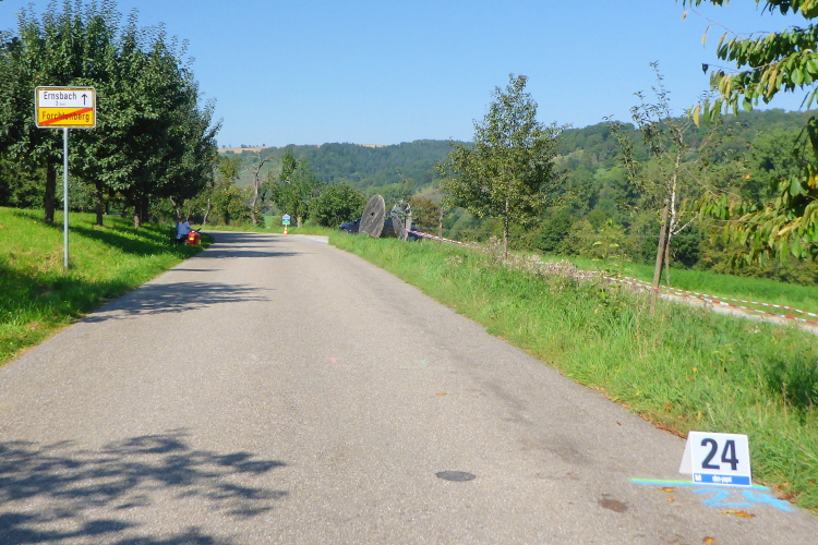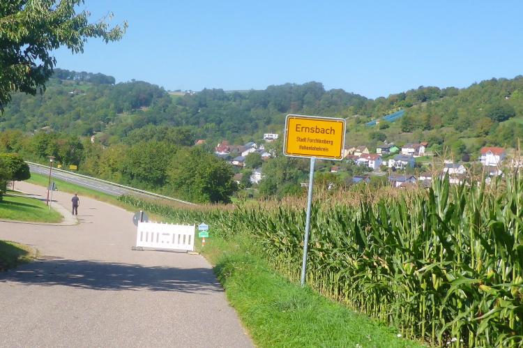 Wir kommen nun über die Kocher. Das Würzburger Tor, der nördliche Zugang zur Altstadt von Forchtenberg, liegt direkt vor mir. Leider werd ich vorher nach rechts geleitet. Es geht durch einen kleinen Park und dann bin ich schon wieder im Grünen. Norbert ist in Sichtweite vor mir. Auf welligem Terrain geht es weiter zwischen Wiesen und Streuobst. Lange Schattenpassagen bieten Entspannung. Die immer wieder auftauchenden Halbmarathonschilder wollen gar nicht zu unserer Kilometrierung passen. Die entgegenkommenden Radler spenden Beifall, das ist eine schöne Abwechslung.