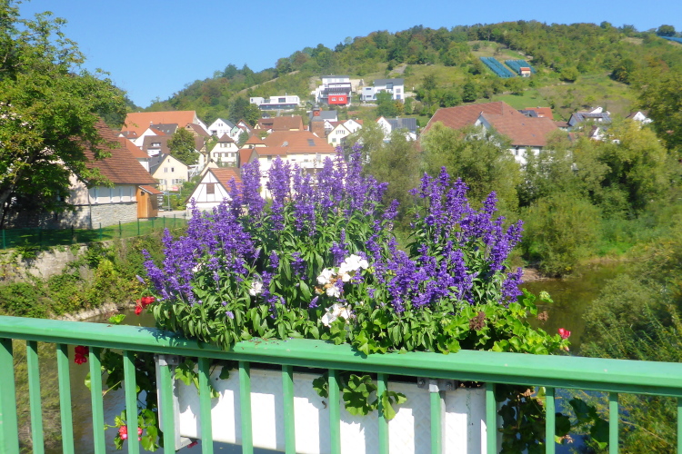 Hier kommt plötzlich Norbert von hinten. Nanu, ich dachte, er wäre weit vor mir. Obwohl ich gleich loslaufe, hat er mich bald wieder eingeholt und läuft locker an mir vorbei. Für uns geht es nun wieder bergauf, bevor wir Niedernhall erreichen. Der Kocherschleife oberhalb folgend, ist Norbert plötzlich verschwunden. Aha, hier geht es steil bergab, deshalb habe ich ihn aus den Augen verloren. Schnell erreiche ich Weißbach. Ich laufe an der schönen evangelischen Kirche rechts mitten durch den Ort, km 17. Es erfordert Konzentration um die Streckenmarkierungen rechtzeitig zu sehen und Zusatzmeter zu vermeiden.