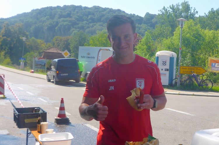 Trotz oder vielleicht gerade wegen des kurzen Zeitfensters stehen kurz vor 8Uhr30 alle pünktlich parat. Norbert und ich treffen viele Bekannte und können sogar noch ein Gruppenfoto schießen bevor es losgeht. Die Kapelle ist bereits abmarschiert, als pünktlich der Start erfolgt. Mit Musik und unter dem Applaus vieler begeisterter Zuschauer werden wir auf die Strecke geschickt. Gänsehautfeeling im Kochertal.