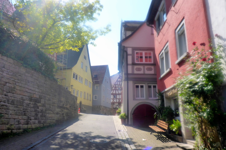 Hinter dem Startkanal bringt uns eine Schleife mitten in die abgesperrte Altstadt. Es ist schon recht warm, für heute sind über 30 °C angesagt, Grund genug, es ruhig angehen zu lassen. Das Hauptfeld enteilt, während ich mir Zeit nehme, die schönen alten Fachwerkhäuser zu bestaunen. Wir passieren die Stadtmauer aus dem Jahr 1363. Sie ist noch gut erhalten und umschließt an drei Seiten den Stadtkern. Auch das Rathaus mit seiner imposanten Freitreppe aus dem Jahre 1477 ist ein Hingucker. Es zählt zu den besterhaltenen historischen Bauwerken in ganz Franken. Das Götzenhaus, ein beeindruckendes Fachwerkgebäude am Ufer der Kocher, war in früherer Zeit Schulhaus und ist nach seinem bekanntesten Schüler, Götz von Berlichingen, benannt.