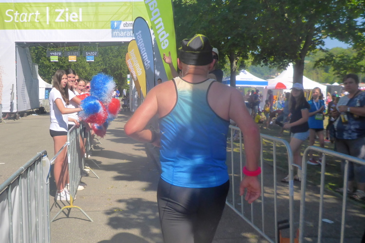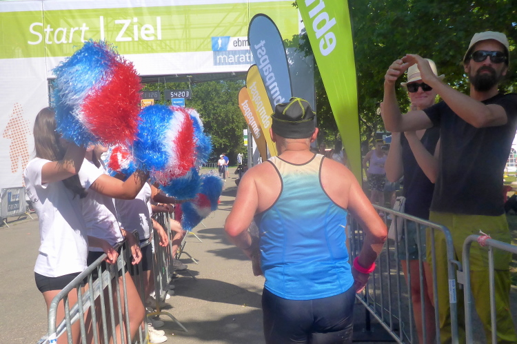 Der Zielkorridor ist abgesperrt. Ich gebe nochmal Gas und laufe dann direkt hinter Norbert. Die Zuschauer applaudieren und Cheerleader geben uns den letzten Kick. Endlich geht es durchs Zieltor. Wir werden sogar gemeinsam angesagt - geschafft. Es gibt eine Medaille in Form eines Ventilators.