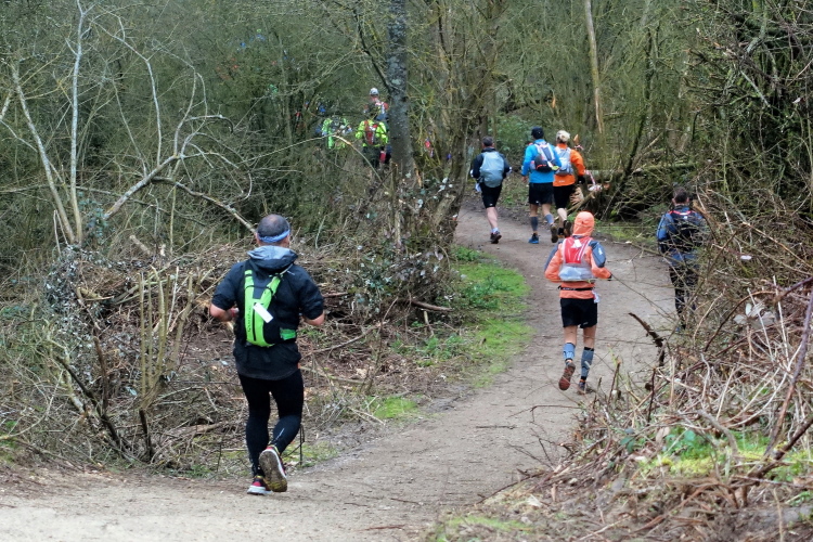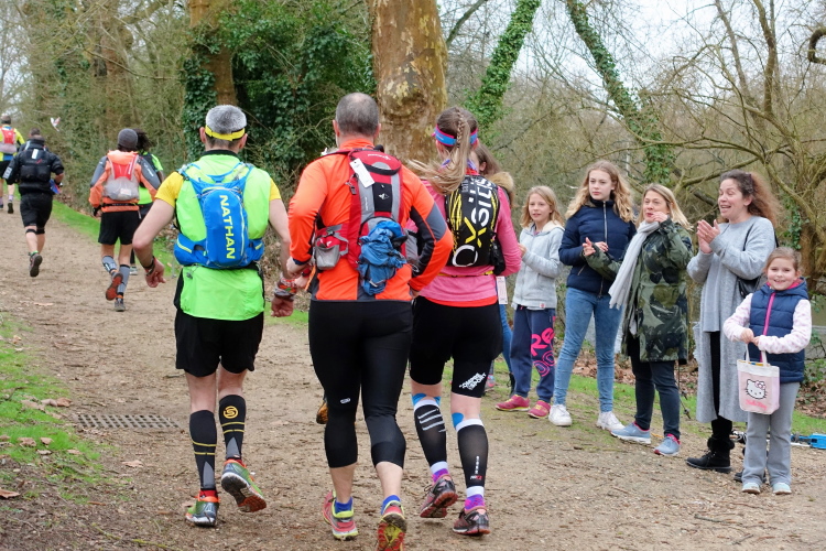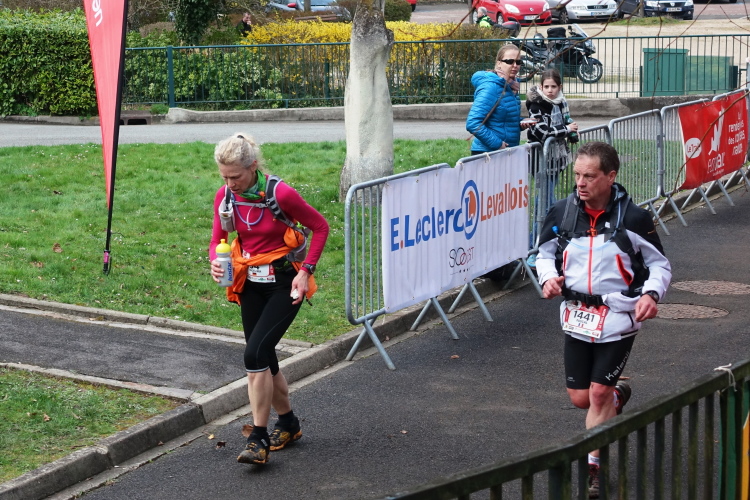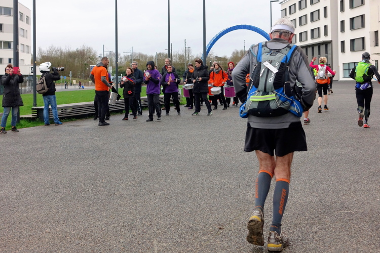 Aber es ist zu anspruchsvoll und der Körper zu keiner Steigerung mehr fähig. Also gilt es jetzt nur noch, nicht nachzulassen. Die Strecke ist bestens markiert mit reflektierenden Bändern, der Wegeverlauf durch dunkle Wälder und Parks immer problemlos. Auch die vielen Leute um uns herum geben Sicherheit. Schlussendlich sind wir am VP Chaville (km 56) zwölf Minuten langsamer als geplant.